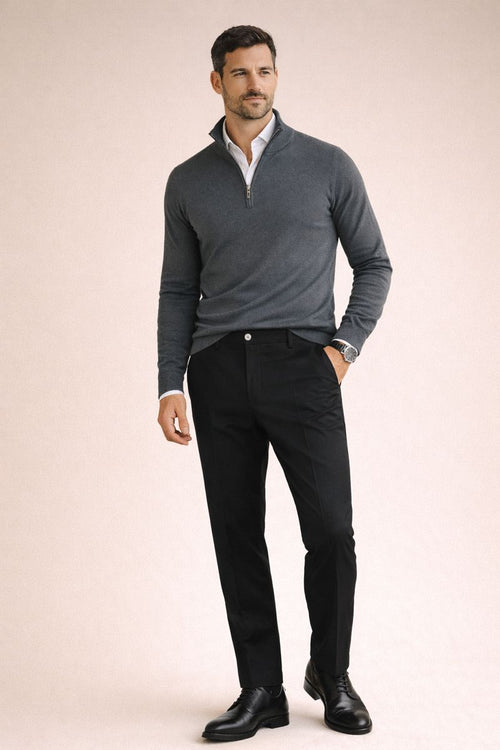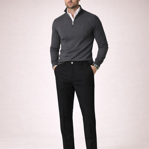 DE SIMO Quarter Zip Sweater is een luxe, fijngebreide trui met subtiele ribstructuur en een elegante halve rits. De s...